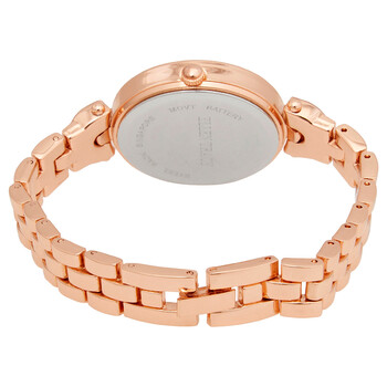 Rose gold-tone stainless steel case with a rose gold-tone alloy mesh bracelet. Fixed rose gold-tone bezel set with crystals. Mother of pearl dial with rose gold-tone hands and index hour markers. Arabic numerals appear at the 6 and 12 o'clock positions. Rhinestone s setat the 3 and 9 o'clock positions. Dial Type: Analog. Quartz movement. Scratch resistant mineral crystal. Pull / push crown. Solid case back. Round case shape. Case size: 30 mm. Jewelry clasp. Water resistant at 10 meters / 30 feet. Functions: hour, minute, second. Dress watch style. Watch label: Japan Movt. Ellen Tracy Quartz Ladies Watch ET5369RG.