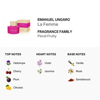 Step into a world of elegance and charm with Emanuel Ungaro La Femme Eau de Parfum Spray for ladies. Launched in 2020, this captivating fragrance blends sweet and fruity notes with a soft floral heart and a warm, comforting base. Designed by the prestigious house of Emanuel Ungaro, La Femme is perfect for women who want to feel confident, graceful, and beautiful every day.
