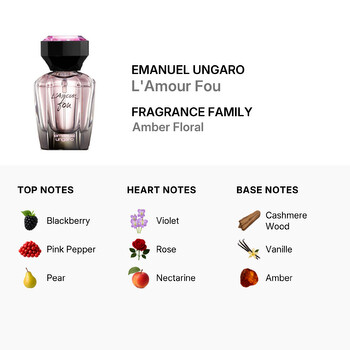 To finish, the base notes of cashmere wood, vanille, and amber add a layer of warm, sensual depth. The luxurious aroma of cashmere wood, the indulgent sweetness of vanille, and the golden warmth of amber create a sophisticated and sensual finish, making L'Amour Fou a perfect scent for the modern lady.