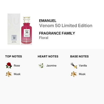 Venom 50 Limited Edition opens with a powerful burst of rose and musk, instantly drawing you in with its rich and romantic top notes. As the fragrance settles, the heart reveals a delicate layer of jasmine—floral, soft, and beautifully balanced. Finally, the base notes of smooth vanilla and warm musk create a comforting and sensual finish that lingers gracefully throughout the day.