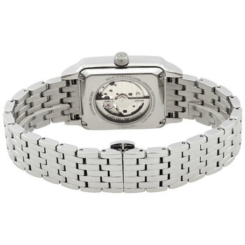 Silver-tone stainless steel case and bracelet. Fixed silver-tone stainless steel bezel. Black dial with silver-tone hands and index hour markers. Minute markers around the inner ring. Dial Type: Analog. Automatic movement. Scratch resistant mineral crystal. Pull / push crown. Transparent case back. Rectangle case shape, case size: 36 mm, case thickness: 13 mm. Band width: 20 mm. Deployment with push button release clasp. Water resistant at 50 meters / 165 feet. Functions: hour, minute, second. Casual watch style. Emporio Armani Automatic Black Dial Men's Watch AR60057.