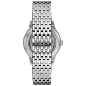 Silver-tone stainless steel case and bracelet. Fixed silver-tone stainless steel bezel. Black dial with silver-tone hands and index hour markers. Minute markers around the outer rim. Dial Type: Analog. Date display at the 6 o'clock position. Automatic movement. Scratch resistant mineral crystal. Pull / push crown. Solid case back. Round case shape, case size: 39 mm, case thickness: 8.7 mm. Band width: 20 mm. Deployment with push button release clasp. Water resistant at 50 meters / 165 feet. Functions: date, hour, minute, second. Dress watch style. Emporio Armani Automatic Black Dial Men's Watch AR60081.