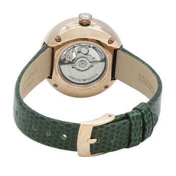 Rose gold-tone stainless steel case with a green leather strap. Fixed rose gold-tone bezel with crystal set. Black mother of pearl dial with rose gold-tone hands and index hour markers. Emporio armani eagle logo marks the 12 o'clock position. Dial Type: Analog. Automatic movement. Scratch resistant mineral crystal. Pull / push crown. Solid case back. Round case shape, case size: 34 mm. Band width: 14 mm. Tang clasp. Water resistant at 30 meters / 100 feet. Functions: hour, minute, second. Dress watch style. Emporio Armani Automatic Crystal Black Mother of Pearl Dial Ladies Watch AR60069.