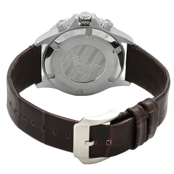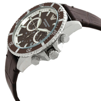Silver-tone stainless steel case with a brown leather strap. Fixed silver-tone stainless steel bezel. Brown dial with silver-tone hands and index hour markers. Minute markers around the outer rim. Dial Type: Analog. Luminescent hands and markers. Date display between 4 and 5 o'clock position. Chronograph - three sub-dials displaying: 60 second, 30 minute and 24 hour. Quartz movement. Scratch resistant mineral crystal. Solid case back. Round case shape, case size: 43 mm, case thickness: 12 mm. Band width: 22 mm. Buckle clasp. Water resistant at 100 meters / 330 feet. Functions: chronograph, date, hour, minute, second. Casual watch style. Emporio Armani Chronograph Quartz Brown Dial Men's Watch AR11486.