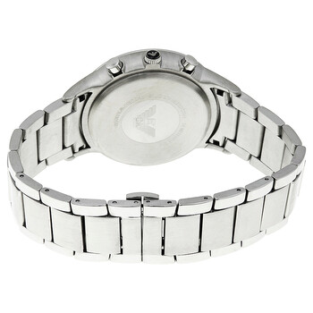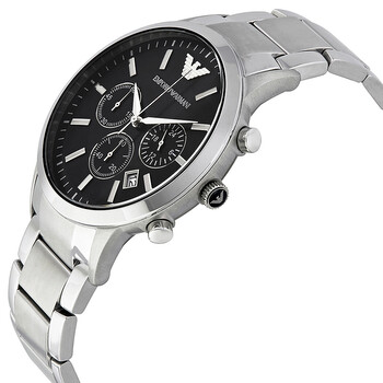 Stainless steel case with a stainless steel bracelet. Fixed stainless steel bezel. Black dial with silver-tone alpha-style shape hands and index hour markers. The Emporio Armani logo appears at the 12 o'clock position. Minute markers around the outer rim. Dial Type: Analog. Date display between the 4 and 5 o'clock positions. Chronograph - three sub-dials displaying: 60 second, 60 minute and 24 hour. Quartz movement. Scratch resistant mineral crystal. Pull / push crown. Solid case back. Round case shape. Case size: 43 mm. Case thickness: 12 mm. Band width: 22 mm. Deployment clasp. Water resistant at 50 meters / 165 feet. Functions: chronograph, date, hour, minute, second. Casual watch style. Emporio Armani Classic Chronograph Black Dial Steel Men's Watch AR2434.