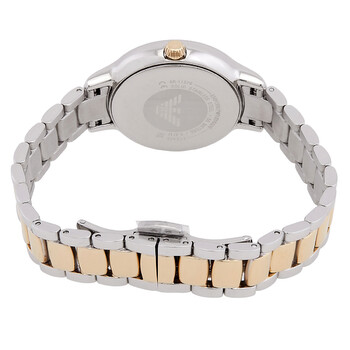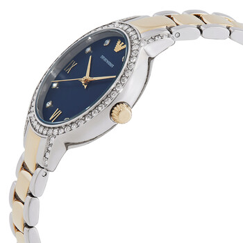 Silver-tone stainless steel case with a two-tone (silver-tone and gold-tone) stainless steel bracelet. Fixed bezel with crystal set. Blue dial with gold-tone hands and crystal-Roman numeral hour markers. Dial Type: Analog. Quartz movement. Scratch resistant mineral crystal. Solid case back. Round case shape, case size: 39 mm, case thickness: 7 mm. Band width: 12 mm. Deployment with push button release clasp. Water resistant at 50 meters / 165 feet. Functions: hour, minute, second. Cleo Series. Dress watch style. Emporio Armani Cleo Quartz Crystal Blue Dial Ladies Watch AR11576.