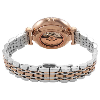 Rose gold-tone stainless steel case with a two-tone (silver-tone and rose gold-tone) stainless steel bracelet. Fixed rose gold-tone bezel set with crystals. White (open heart) dial with rose gold-tone hands and index hour markers. Roman numerals appear at the 3, 6 and 9 o'clock position. The Emporio Armani Eagle appears at the 12 o'clock position. Dial Type: Analog. Automatic movement. Scratch resistant mineral crystal. Pull / push crown. Solid case back. Round case shape. Case size: 34 mm. Case thickness: 7 mm. Band width: 14 mm. Deployment clasp. Water resistant at 50 meters / 165 feet. Functions: hour, minute, second. Gianni T-bar Series. Casual watch style. Emporio Armani GIANNI T-BAR Automatic White Dial Watch AR60019.
