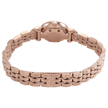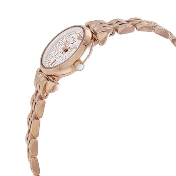 Rose gold-tone stainless steel case and bracelet. Fixed rose gold-tone bezel. White (crystal pave) dial with rose gold-tone hands. Index markers at the 3, 6 and 9 o'clock positions. The Emporio Armani Eagle appears at the 12 o'clock position. Dial Type: Analog. Quartz movement. Scratch resistant mineral crystal. Pull / push crown. Solid case back. Round case shape. Case size: 22 mm. Case thickness: 7 mm. Band width: 10 mm. Fold over clasp with a push button release. Water resistant at 30 meters / 100 feet. Functions: hour, minute. Gianni T-bar Series. Casual watch style. Emporio Armani Gianni T-Bar Quartz White Dial Ladies Watch AR11266.