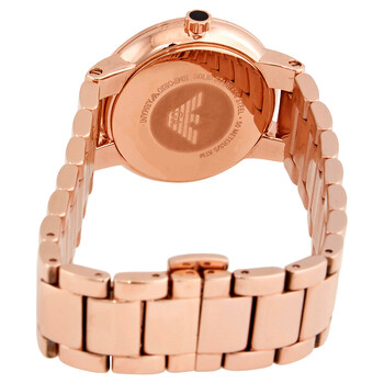Rose gold-tone stainless steel case and bracelet. Fixed rose gold-tone bezel. Black dial with rose gold-tone hands and crystal hour markers. Index markers appear at the 3, 6 and 9 o'clock positions. Minute markers around an inner ring. The Emporio Armani Eagle appears at the 12 o'clock position. Dial Type: Analog. Quartz movement. Scratch resistant mineral crystal. Pull / push crown. Solid case back. Round case shape. Case size: 32 mm. Case thickness: 8 mm. Band width: 18 mm. Fold over clasp with a push button release. Water resistant at 50 meters / 165 feet. Functions: hour, minute, second. Greta Series. Casual watch style. Emporio Armani Greta Quartz Crystal Black Dial Ladies Watch AR11251.