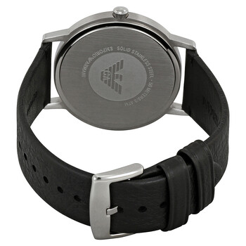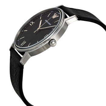 Stainless steel case with a black leather strap. Fixed stainless steel bezel. Black dial with luminous silver-tone hands and index hour markers. Roman numerals mark the 3, 6 and 9 o'clock positions. Minute markers around the outer rim. The Emporio Armani logo appears at the 12 o'clock position. Dial Type: Analog. Luminescent hands and markers. Quartz movement. Scratch resistant mineral crystal. Pull / push crown. Solid case back. Round case shape. Case size: 43 mm. Case thickness: 12 mm. Band width: 22 mm. Tang clasp. Water resistant at 50 meters / 165 feet. Functions: hour, minute, second. Dress watch style. Emporio Armani Kappa Black Dial Black Leather Men's Watch AR11013.