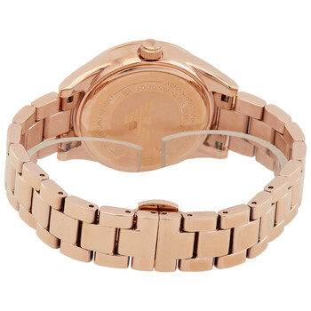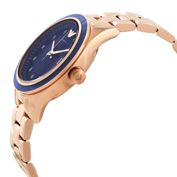 Rose gold-tone stainless steel case and bracelet. Fixed rose gold-tone stainless steel beel with an inlaid blue ring. Blue dial with rose gold-tone hands and crystal hour markers. Minute markers around the outer rim. Dial Type: Analog. Date display at the 3 o'clock position. Quartz movement. Scratch resistant mineral crystal. Pull / push crown. Solid case back. Round case shape, case size: 36 mm. Band width: 14 mm. Deployant clasp. Water resistant at 50 meters / 165 feet. Functions: date, hour, minute, second. Leo Series. Dress watch style. Emporio Armani Leo Quartz Crystal Blue Dial Ladies Watch AR11449.