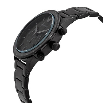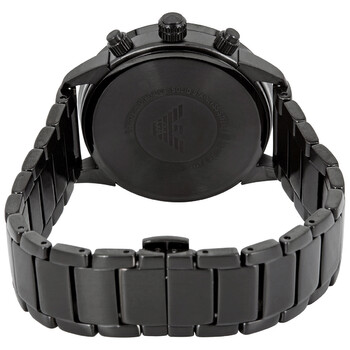 Black-plated stainless steel case and bracelet. Fixed black-plated bezel showing tachymeter markings. Black dial with grey hands and index hour markers. Minute markers around the outer rim. The Emporio Armani Eagle appears at the 12 o'clock position. Dial Type: Analog. Luminescent hands and markers. Date display between the 4 and 5 o'clock positions. Chronograph - three sub-dials displaying: 60 second, 30 minute and 24 hour. Quartz movement. Scratch resistant mineral crystal. Solid case back. Round case shape. Case size: 43 mm. Case thickness: 12 mm. Band width: 22 mm. Fold over clasp with a push button release. Water resistant at 30 meters / 100 feet. Functions: chronograph, tachymeter, date, hour, minute, second. Mario Series. Casual watch style. Emporio Armani Mario Chronograph Quartz Black Dial Men's Watch AR11242.