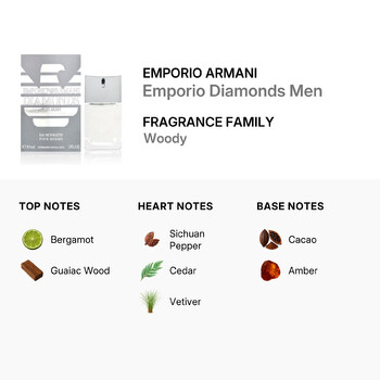 Discover the captivating allure of Emporio Diamonds Men by Emporio Armani, launched in 2008. This exquisite fragrance is designed for the modern man who appreciates sophistication and elegance. The scent opens with invigorating top notes of bergamot and guaiac wood, setting a bold yet refined tone.