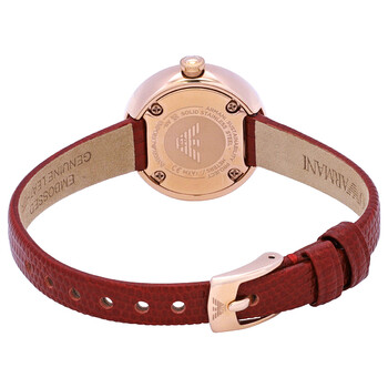 Rose gold-tone at least 50% recycled stainless steel case with a red leather strap. Fixed rose gold-tone bezel with crystal set. White mother of pearl dial with rose gold-tone hands and crystal hour markers. Dial Type: Analog. Quartz movement. Scratch resistant mineral crystal. Pull / push crown. Solid case back. Round case shape, case size: 26 mm. Buckle clasp. Water resistant at 50 meters / 165 feet. Functions: hour, minute. Dress watch style. Emporio Armani Quartz Crystal Ladies Watch AR11475.