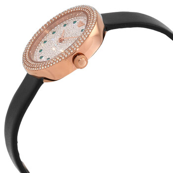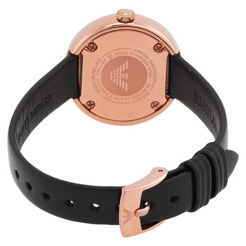 Rose gold-tone stainless steel case with a black leather strap. Fixed rose gold-tone bezel with crystal set. Silver dial with rose gold-tone hands and crystal hour markers. Dial Type: Analog. Quartz movement. Scratch resistant mineral crystal. Pull / push crown. Solid case back. Round case shape, case size: 30 mm. Band width: 12 mm. Tang clasp. Water resistant at 30 meters / 100 feet. Functions: hour, minute. Dress watch style. Emporio Armani Quartz Crystal Silver Dial Ladies Watch AR11492.