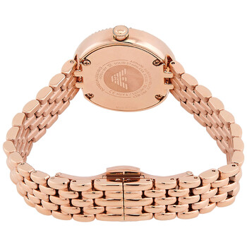 Rose gold-tone stainless steel case and bracelet. Fixed rose gold-tone bezel with crystal set. Silver dial with rose gold-tone hands and crystal hour markers. Dial Type: Analog. Quartz movement. Scratch resistant mineral crystal. Pull / push crown. Solid case back. Round case shape, case size: 30 mm. Band width: 12 mm. Butterfly deployant clasp. Water resistant at 30 meters / 100 feet. Functions: hour, minute. Dress watch style. Emporio Armani Quartz Crystal Silver Dial Ladies Watch AR11508.