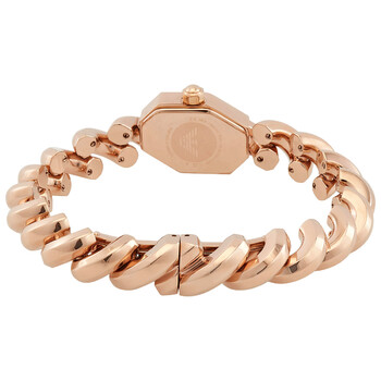 Rose gold-tone stainless steel case and bracelet. Fixed rose gold-tone stainless steel bezel. White mother of pearl dial with rose gold-tone hands and crystal hour markers. Dial Type: Analog. Quartz movement. Scratch resistant mineral crystal. Pull / push crown. Solid case back. Unique case shape, case size: 23 mm. Band width: 12 mm. Butterfly deployant clasp. Water resistant at 30 meters / 100 feet. Functions: hour, minute. Dress watch style. Emporio Armani Quartz Crystal White Mother of Pearl Dial Ladies Watch AR11479.