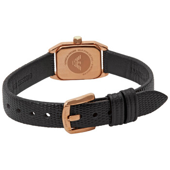 Rose gold-tone stainless steel case with a black leather strap. Fixed rose gold-tone bezel. Mother of pearl dial with rose gold-tone hands. Crystals set at the 3, 6 and 9 o'clock positions. The Emporio Armani Eagle appears at the 12 o'clock position. Dial Type: Analog. Quartz movement. Scratch resistant mineral crystal. Pull / push crown. Solid case back. Square case shape. Case dimensions: 22 mm x 17 mm. Case thickness: 5 mm. Band width: 10 mm. Tang clasp. Water resistant at 30 meters / 100 feet. Functions: hour, minute. Emporio Armani Quartz Mother of Pearl Dial Ladies Watch AR11248.