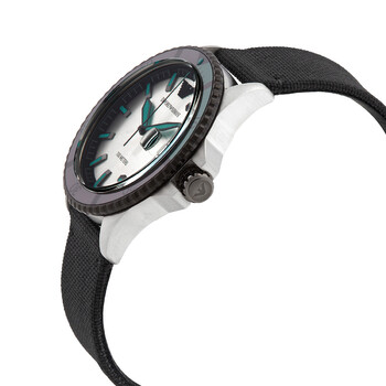 Silver-tone at least 50% recycled stainless steel case with a black fabric strap. Uni-directional rotating bezel. Silver dial with black hands and index hour markers. Minute markers around the outer rim. Dial Type: Analog. Date display at the 3 o'clock position. Quartz movement. Scratch resistant mineral crystal. Pull / push crown. Solid case back. Round case shape, case size: 42 mm, case thickness: 11 mm. Band width: 22 mm. Buckle clasp. Water resistant at 100 meters / 330 feet. Functions: date, hour, minute, second. Casual watch style. Emporio Armani Quartz Silver Dial Men's Watch AR11465.
