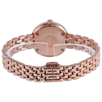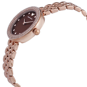 Rose gold-tone stainless steel case and bracelet. Fixed rose gold-tone bezel set with crystals. Brown dial with rose gold-tone hands and crystal hour markers. The Emporio Armani Eagle appears at the 12 o'clock position. Dial Type: Analog. Quartz movement. Scratch resistant mineral crystal. Pull / push crown. Solid case back. Round case shape. Case size: 30 mm. Band width: 12 mm. Butterfly clasp. Water resistant at 30 meters / 100 feet. Functions: hour, minute. Rosa Series. Dress watch style. Emporio Armani Rosa Quartz Crystal Brown Dial Ladies Watch AR11418.