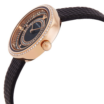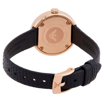 Rose gold-tone stainless steel case with a black leather strap. Fixed bezel with crystal set. Black crystal dial with rose gold-tone hands and crystal hour markers. Dial Type: Analog. Quartz movement. Pull / push crown. Solid case back. Round case shape, case size: 30 mm, case thickness: 7 mm. Tang clasp. Water resistant at 30 meters / 100 feet. Functions: hour, minute. Rosa Series. Dress watch style. Emporio Armani Rosa Quartz Crystal Ladies Watch AR11493.