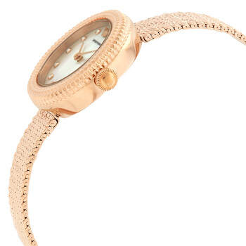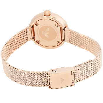 Rose gold-tone stainless steel case with a rose gold-tone stainless steel mesh bracelet. Fixed rose gold-tone bezel with crystal set. White dial with rose gold-tone hands and crystal hour markers. Dial Type: Analog. Quartz movement. Scratch resistant mineral crystal. Pull / push crown. Solid case back. Round case shape, case size: 26 mm. Band width: 7 mm. Safety mesh buckle clasp. Water resistant at 30 meters / 100 feet. Functions: hour, minute. Rosa Series. Dress watch style. Emporio Armani Rosa Quartz Crystal White Dial Ladies Watch AR11416.