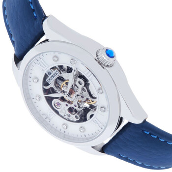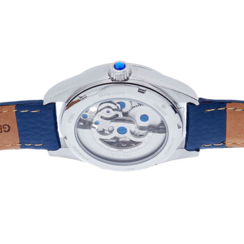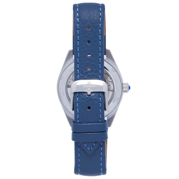 Band Color: Blue Genuine Leather; Band Width: 18mm near case; 16mm near clasp/buckle; Bezel Color: Silver; Case: Silver + Circle-Shaped; Case Finish: Polished + Stainless Steel; Case Thickness: 13mm; Case Width: 37mm; 41mm with Crown; Clasp / Buckle: Strap Buckle; Dial: White + Analog; Hand Color: Silver; Movement: Chinese + Automatic; Time Zones: Single; Water Resistance: 5 ATM.