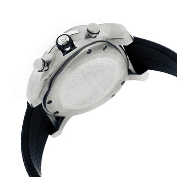 Stainless steel case with a black rubber strap. Fixed gold-tone bezel. Silver dial with luminous black hands and Arabic numeral hour markers. Dial Type: Analog. Luminescent hands. Date display between 4 and 5 o'clock position. Chronograph - three sub-dials displaying: 60 second, 60 minute and 24 hour. Quartz movement. Scratch resistant mineral crystal. Screw-down crown. Screw in case back. Case diameter: 50 mm. Case thickness: 16 mm. Unique case shape. Band width: 24mm. Fold over deployment clasp. Water resistant at 100 meters (330 feet). Functions: chronograph, hour, minute, second. Sport watch style. Equipe Grille Men's Watch E207.