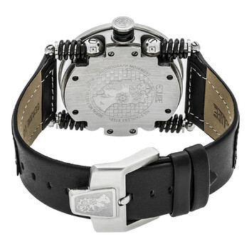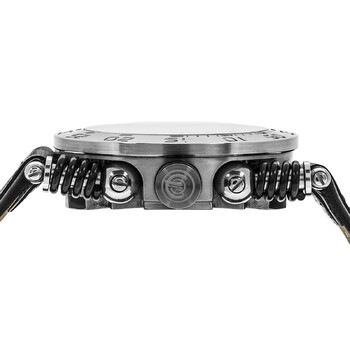 Stainless steel case with a black leather strap. Fixed stainless steel bezel. Orange dial with luminous silver-tone hands and index hour markers. Dial Type: Analog. Luminescent hands and markers. Date display at the 3 o'clock position. Two multi-function sub-dials displaying: date and day of the week. Quartz movement. Scratch resistant mineral crystal. Solid case back. Round case shape. Case size: 45 mm. Case thickness: 13 mm. Band width: 30 mm. Tang clasp. Water resistant at 200 meters / 660 feet. Functions: date, day, hour, minute, second. Coil Series. Sport watch style. Item Variations: EQUET109. Equipe Tritium Coil Orange Dial Men's Watch ET109.