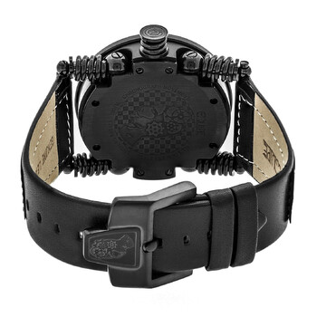 Black stainless steel case with a black leather strap. Black bezel. Red dial with silver-tone hands and Arabic numeral hour markers. Minute markers around the outer rim. Dial Type: Analog. Luminescent hands and markers. Date display at the 3 o'clock position. Two - date and day subdials. Quartz movement. Scratch resistant mineral crystal. Round case shape, case size: 45 mm, case thickness: 13 mm. Band width: 30 mm. Buckle clasp. Water resistant at 200 meters / 660 feet. Functions: date, day, hour, minute, second. Sport watch style. Item Variations: EQUET102. Equipe Tritium Coil Red Dial Men's Watch ET102.