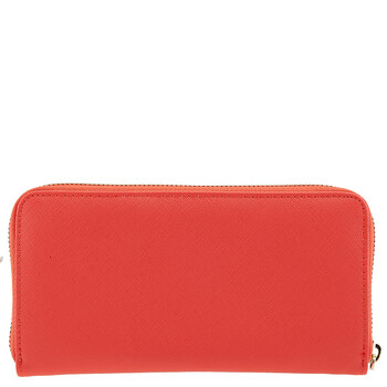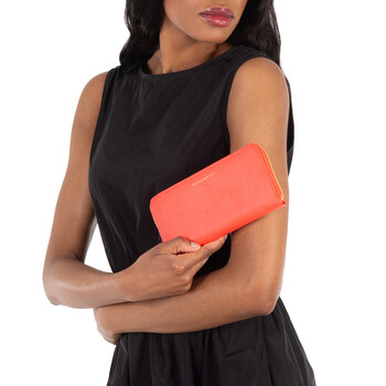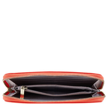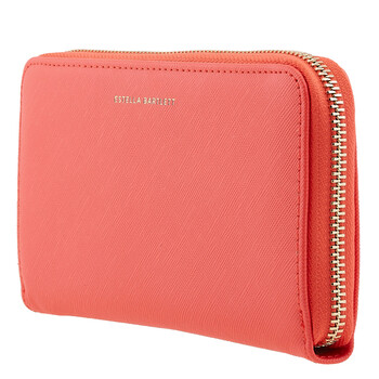 Estella Bartlett Ladies Wallets. SKU: EBP3096. Color: Coral. Size: 19.5 x 9.5 x 2 cm. Estella Bartlett Coral Zip-Around Continental Wallet. The Estella Bartlett wallet features a gold zipper, with "Estella Bartlett" embossed in gold on the top. It has tone-on-tone stitching, two bill compartments, 12 card slots, a driver's license slot with a transparent protective film, and an interior zippered coin compartment. Material: 100% recycled LDPE ( soft polyethylene ).