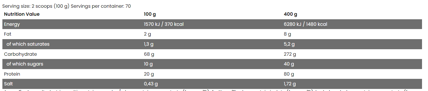 FA Nutrition - Core Mass ფხვნილი, ნახშირწყლოვან-ცილოვანი სასმელის მოსამზადებლად. თითოეული პორცია შეიცავს 68 გრ ნახშირწყლებს.