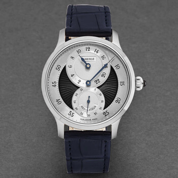 18kt white gold case with a blue leather strap. Fixed 18kt white gold bezel. Silver-tone dial with blue hands and Arabic numeral hour markers. Minute markers around the outer rim. Dial Type: Analog. Hand wind movement. Scratch resistant sapphire crystal. Pull / push crown. Transparent case back. Round case shape, case size: 40 mm, case thickness: 11 mm. Band width: 20 mm, band length: 8 inches. Deployment with push button release clasp. Water resistant at 50 meters / 165 feet. Functions: hour, minute, second. Additional Info: 24 hour, minute, second. Agathon Series. Luxury watch style. Faberge Agathon Hand Wind Silver Dial Men's Watch FAB-216.