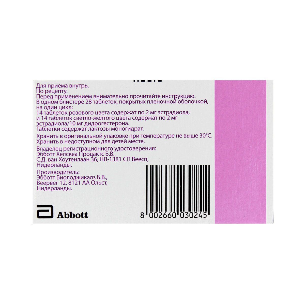 28 დღიანი ციკლის პირველ 14 დღეს მიიღება ყოველდღიურად ნარინჯისფერი ერთი ტაბლეტი, რომელიც შეიცავს 2მგ ესტრადიოლს, დარჩენილი 14 დღე – ყოველდღიურად 1 ყვითლი ტაბლეტი, რომელიც შეიცავს 2მგ ესტრადიოლს და 10მგ დიდროგესტერონს.