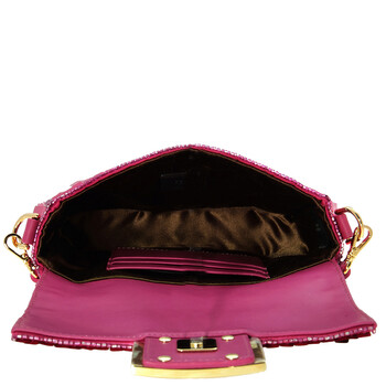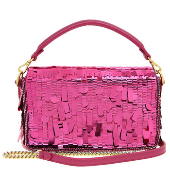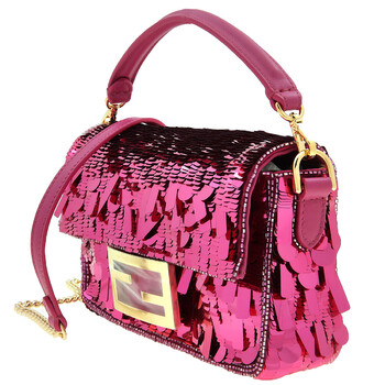 Fendi Ladies Shoulder Bag. SKU: 8BS017-AMP0-F1MQA. Color: Ciclamino Pilar. Size: H: 13 cm × D: 5 cm × W: 20 cm. Fendi Baguette Embroidered Sequins Chain Strap Bag. This bag features hand-embroidered with sequins of different shapes and sizes, trimmed in calfskin, designed with an FF clasp, a front flap with a magnetic clasp, a satin-lined internal compartment with a leather pocket, and gold-finished metalware. 82% polyester, 18% resin, embroidery 1: 100% glass, 100% polyester, 100% calf leather, inside: 100% calf leather, 72% viscose, 28% silk. Made in Italy.