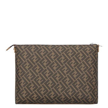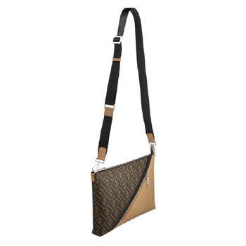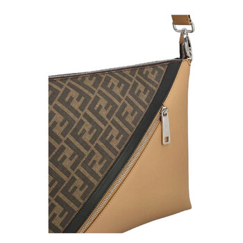 Fendi Men's Messenger. SKU: 7VA470-ALKA-F1IKC. Color: Tbmr/Black/Sand/P. Size: H: 25 cm × D: 5.5 cm × W: 34 cm. Fendi Diagonal FF Messenger Bag. This messenger bag is crafted from FF canvas and leather, featuring a leather diagonal insert. It includes a central compartment with a zip fastening, an internal zip pocket, and palladium-finish metalware. The tech fabric strap with logo lettering is adjustable and detachable. 45% cotton, 40% polyurethane, 15% polyester, 100% calf leather, inside: 63% cotton, 34% polyester, 3% acrylic. Made in Italy.