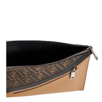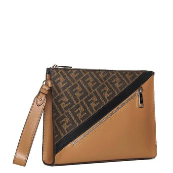 Fendi Men's Clutch. SKU: 7VA491 AJF8 F1EGA. Color: Brown. Size: H: 20 cm × D: 6 cm × W: 27 cm. Fendi Diagonal FF Zip Clutch Purse. The clutch is crafted from leather and fabric with an FF motif, embellished with a leather diagonal insert and a wrist strap. It features a zipper closure and palladium-finish metalware. 100% Calf Leather, 45% Cotton, 40% Polyurethane, 15% Polyester. Made in Italy.