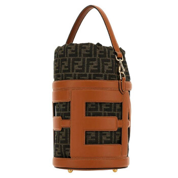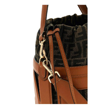 Fendi Ladies Bucket Bag. SKU: 8BT364-APES-F1LEN. Color: Brandy /Tabacco Brown /Soft Go. Size: W: 20cm × H: 27cm × D: 20cm. Fendi Embroidered Jacquard Leather Bucket Bag. This bucket bag features padded and contoured embroidered logo lettering, a fixed internal pouch in FF motif jacquard fabric, a drawstring closure, and gold-finish metalware. 100% Calfskin, 62% Polyester, 33% Cotton, 5% Resin. Made in Italy.