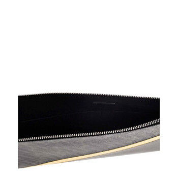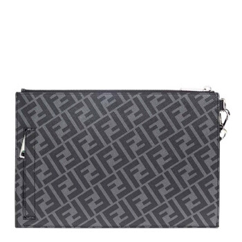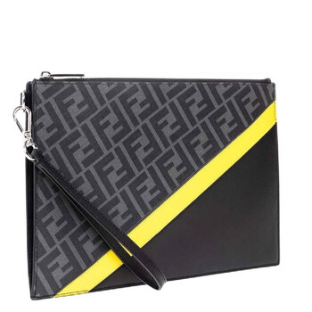Fendi Men's Pouch. SKU: 7N0110-A9XS-F0R2A. Color: Black /Sunflower /Palladium. Size: 8.2" x 11.8" x 1.18". Fendi FF Logo Jacquard Flat Pouch. This Pouch features two pockets, an internal card holder, a zippered pocket on the back and a removable bracelet handle. 45% Cotton, 40% Polyurethane, 15% Polyester, 100% Calfskin. Made In Italy.
