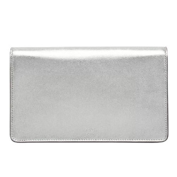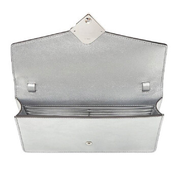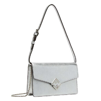 Brand: Fendi. SKU: 8M0488-A9PY-F0MK5. Color: Argento/Palladio. Size: 5.31"x8.27"x1.97". Fendi FF Logo Laminated Leather Chain Wallet. A compact wallet in silver laminated leather featuring a geometric flap with a diagonal FF logo, a single-compartment interior with a flat pocket and six card slots, and removable adjustable leather and chain shoulder straps, finished with palladium-finish metalware. 100% Calf Leather, 50% Polyamide, 50% Polyurethane. Made In Italy.