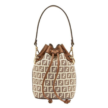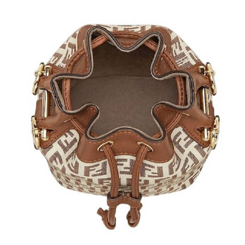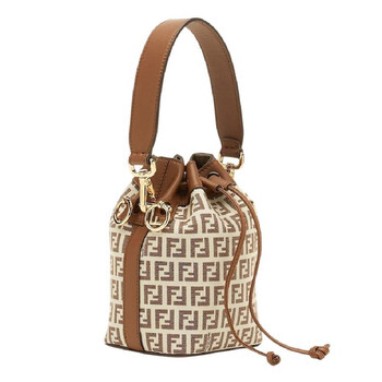Fendi Ladies Bucket Bag. Mon Tresor series. SKU: 8BS010ARBNF1NXB. Color: Brown. Size: 7.09"x4.72"x3.94". Fendi Ff Logo Pattern Mon Tresor Bucket Bag. This Bucket Bag features a drawstring top closure, a top handle, a single interior compartment and a detachable shoulder strap. 34% Cotton, 12% Polyester, 27% Polyamide, 27% Polyurethane, 100% Calf Leather. Made In Italy.