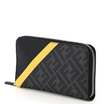 Fendi Men's Wallets. SKU: 7M0210-A9XS-F0R2A. Color: Black/Sunflower/Pall.. Size: H: 10 cm × D: 2 cm × W: 19 cm. Fendi FF Motif Continental Zip Wallet. This wallet is crafted from textured weave fabric with an FF motif, features a zip closure, with three gusseted compartments, eight card slots, a zip pocket, it is embellished with a leather insert and inlaid detail, along with leather lining. 100% Leather. Made in Italy.