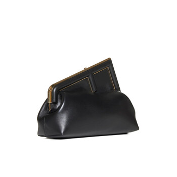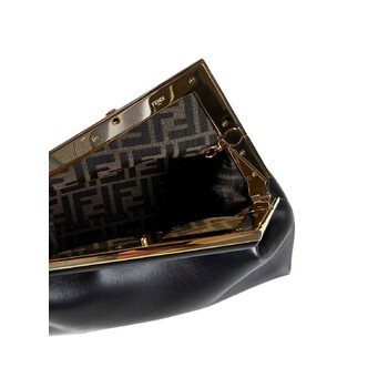 Fendi Ladies Clutch. SKU: 8BP137-ABVE-F0KUR. Barcode: 2004004726643. Color: Black/Oro Soft. Size: H: 20 x D: 14 x W: 30 cm. Fendi First Midi Nappa Leather Clutch. The Fendi First bag, crafted in soft black nappa leather with a tone-on-tone oversized metal F clasp, features a fabric-lined interior with the iconic FF motif, removable hooks, gold-finish metalware, and versatility to be carried as a clutch or worn cross-body with its detachable strap. 100% Nappa Leather.