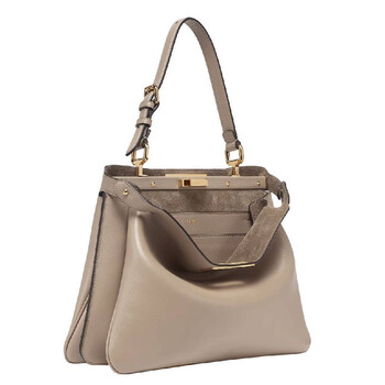 Fendi Ladies Handbag. SKU: 8BN353-AOVH-F0E65. Color: Tortora/Os. Fendi Iconic Twist Lock Soft Bag. This bag features a suede lined interior with two internal compartments divided by a stiff partition and a leather internal pocket with logo print. 10.39"*12.99"*3.93". 100% Calfskin Leather. Made in Italy.