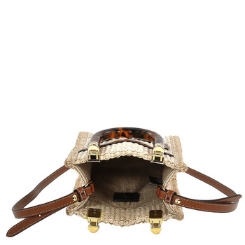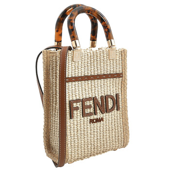Fendi Tote. SKU: 8BS051ANWSF1LMM. Color: Beige. Size: Height : 18 cm x Depth : 6.5 cm x Width : 13 cm. Fendi Mini Sunshine shopper is crafted from natural-colored straw woven in a moss-stitch effect, adding a touch of rustic charm. The FENDI ROMA lettering is elegantly embossed in brown leather, creating a subtle yet distinctive detail. Handles: The stiff tortoiseshell-effect plexiglass handles provide a structured and sophisticated touch. Features a lined internal compartment, offering practicality without compromising on style. It's a perfect balance of form and function.Brown leather edges frame the straw body, providing durability and a refined finish. The combination of natural straw and brown leather creates a harmonious and timeless aesthetic. Gold-finish metalware adds a luxurious touch to the overall design. Made in Italy.