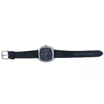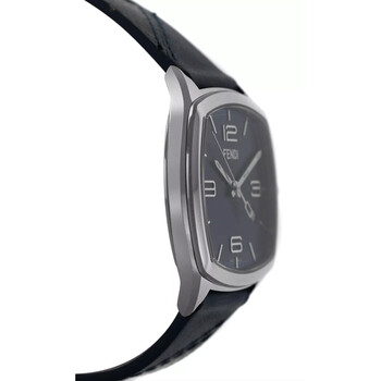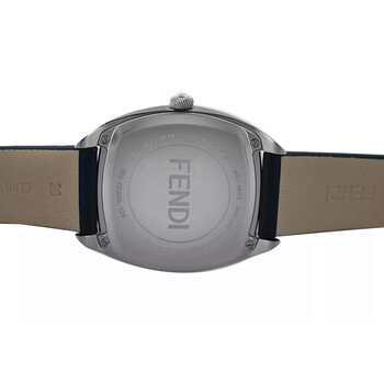 Silver-tone stainless steel case with a leather strap. Fixed silver-tone stainless steel bezel. Blue dial with silver-tone hands and Arabic numeral & index hour markers. Minute markers around the outer rim. Dial Type: Analog. Luminescent hands and markers. Date display at the 4 o'clock position. Quartz movement. Scratch resistant sapphire crystal. Solid case back. Cushion case shape, case size: 39 mm. Buckle clasp. Functions: date, hour, minute, second. Momento Series. Luxury watch style. Watch label: Swiss Made. Fendi Momento Quartz Blue Dial Men's Watch F220013031.
