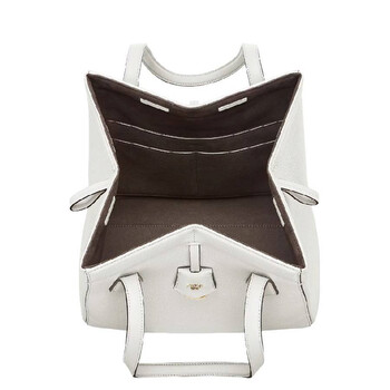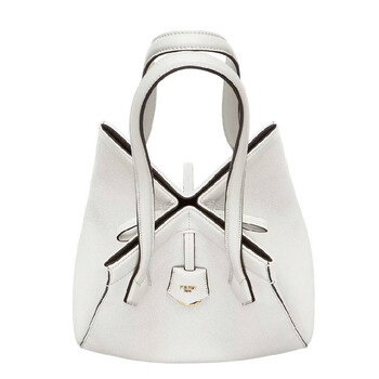 Fendi Ladies Bucket Bag. SKU: 8BH414-APZA-F0K7E. Color: Bianco Ice/Os. Size: H: 27cm × D: 16.5cm × W: 27cm. Fendi Origami Leather Bucket Bag. This bucket bag is crafted from full-grain leather and features eight concealed magnets, allowing it to be styled as either a shopper bag or a bucket bag by folding it origami-style. It includes leather handles, a key case charm with the brand logo in metal, a lined inner compartment, and gold-finished metalware. 100% calfskin, inside: 60% polyamide, 40% polyurethane. Made in Italy.