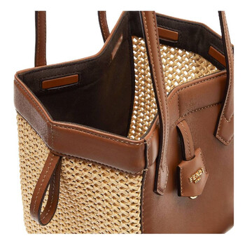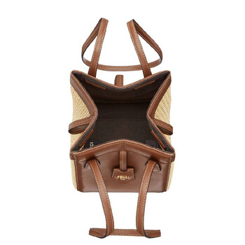 Fendi Ladies Bucket Bag. SKU: 8BS083-AOVR-F1PIF. Color: Gianduia/Naturale/Os. Size: H: 18.5 cm × D: 15 cm × W: 15 cm. Fendi Origami Mini Bucket Bag. This bucket bag is crafted from smooth leather with crochet straw panels and features an innovative closure with eight magnets, allowing it to fold origami-style. When the magnets come together in the middle with a magic clasp, it transforms from a bucket bag into a shopper by pulling the leather ties on the short shoulder straps on each side. It also includes a leather key case charm with metal logo lettering, a lined inner compartment, and gold-finish metalware. 100% viscose, 100% calf leather, inside:60% polyamide, 40% polyurethane. Made in Italy.
