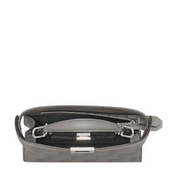 Fendi Men's Crossbody. SKU: 7VA582-AP1T-F1M6H. Color: Moon/Argilla/P. Fendi Peekaboo Leather Crossbody Bag. . This bag features the iconic twist lock at the front and a zipper closure at the back. Inside, it has tone-on-tone leather lining, two compartments separated by a stiff partition, a contrasting-color cardholder slot, and palladium-finish metal hardware. It also includes an adjustable, detachable shoulder strap made of webbing with Fendi lettering. 100% Calfskin, interior: 100% Calfskin, 90% Polyester, 10% Polyurethane.