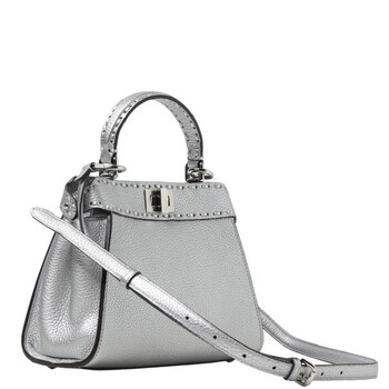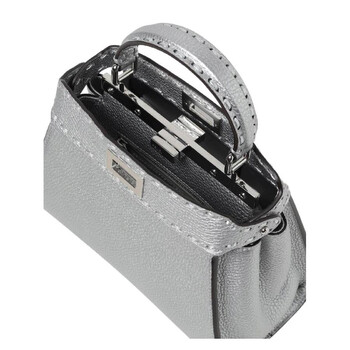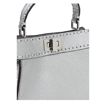 Fendi Ladies Handbag. SKU: 8BN244-ALVK-F0MK5. Color: Argento/Palladio. Size: H: 18 cm × D: 11 cm × W: 23 cm. Fendi Peekaboo Leather Handbag. This bag is crafted from Cuoio Romano leather, embellished with tone-on-tone hand stitching and designed with a twist lock on both sides. It features a lining with the Selleria stamp in leather, two internal compartments divided by a stiff partition, an inner zipper pocket, and palladium-finished hardware. 100% calf leather, inside: 100% sheep leather. Made in Italy.